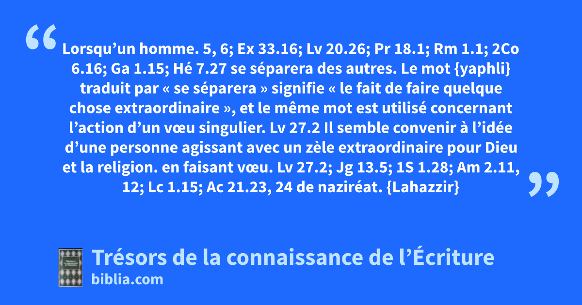 Lorsqu’un homme. 5, 6; Ex 33.16; Lv 20.26; Pr 18.1; Rm 1.1; 2Co 6.16; Ga 1.15; Hé 7.27 se séparera des autres. Le mot {yaphli} traduit par « se séparera » signifie « le fait de faire quelque chose extraordinaire », et le même mot est utilisé concernant l’action d’un vœu singulier. Lv 27.2 Il semble convenir à l’idée d’une personne agissant avec un zèle extraordinaire pour Dieu et la religion. en faisant vœu. Lv 27.2; Jg 13.5; 1S 1.28; Am 2.11, 12; Lc 1.15; Ac 21.23, 24 de naziréat. {Lahazzir} de {nazar} être séparé, d’où {nazir} un Nazaréen, c.-à-d. une personne séparée de tout emploi servile. Les Nazaréens étaient de deux sortes : ceux consacrés à Dieu par leurs parents lors de leur enfance, ou même avant leur naissance, et ceux qui se séparaient eux-mêmes. Les premiers étaient Nazaréens à vie, et les autres observaient la loi du naziréat pour un temps déterminé. Les Nazaréens à vie n’étaient pas soumis à la même rigueur que ceux dont parle ici la loi.