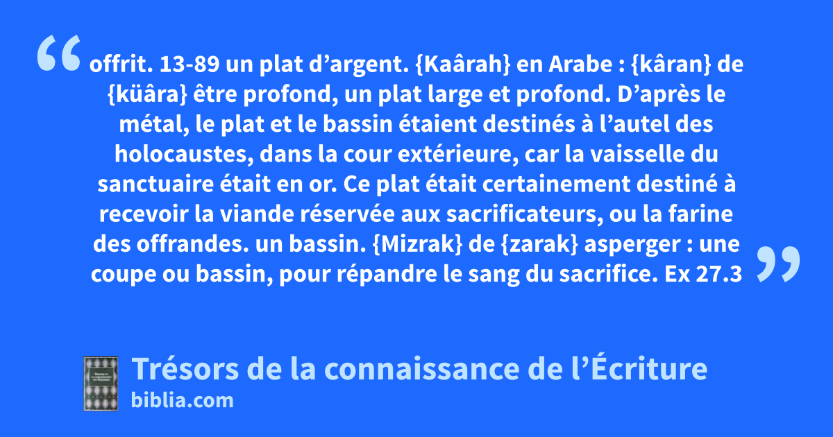 offrit. 13-89 un plat d’argent. {Kaârah} en Arabe : {kâran} de {küâra} être profond, un plat large et profond. D’après le métal, le plat et le bassin étaient destinés à l’autel des holocaustes, dans la cour extérieure, car la vaisselle du sanctuaire était en or. Ce plat était certainement destiné à recevoir la viande réservée aux sacrificateurs, ou la farine des offrandes. un bassin. {Mizrak} de {zarak} asperger : une coupe ou bassin, pour répandre le sang du sacrifice. Ex 27.3