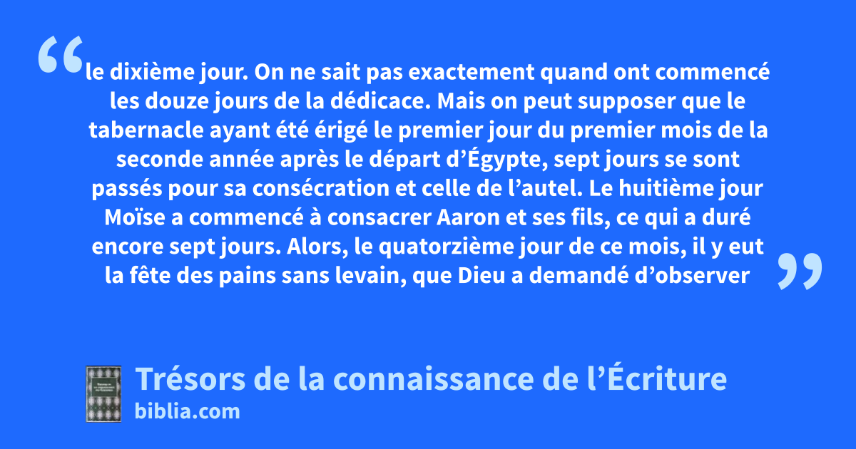 le dixième jour. On ne sait pas exactement quand ont commencé les douze jours de la dédicace. Mais on peut supposer que le tabernacle ayant été érigé le premier jour du premier mois de la seconde année après le départ d’Égypte, sept jours se sont passés pour sa consécration et celle de l’autel. Le huitième jour Moïse a commencé à consacrer Aaron et ses fils, ce qui a duré encore sept jours. Alors, le quatorzième jour de ce mois, il y eut la fête des pains sans levain, que Dieu a demandé d’observer le premier mois. La dédicace a du se prolonger jusqu’au dix-neuvième jour du second mois, et le vingtième ils sont partis du Sinaï vers le désert de Paran. 10.11, 12 Ahiézer. 1.12; 2.25