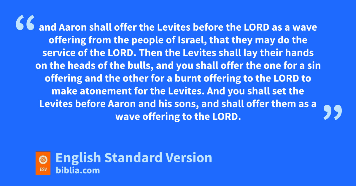 5 And the Lord spoke to Moses, saying, 6 “Take the Levites from among the people of Israel and cleanse them. 7 Thus you shall do to them to cleanse them: sprinkle the jwater of purification upon them, and klet them go with a razor over all their body, and wash their clothes and cleanse themselves. 8 Then let them take a bull from the herd and lits grain offering of fine flour mixed with oil, mand you shall take another bull from the herd for a sin offering. 9 nAnd you shall bring the Levites before the tent of meeting oand assemble the whole congregation of the people of Israel. 10 When you bring the Levites before the Lord, the people of Israel pshall lay their hands on the Levites, 11 and Aaron shall offer the Levites before the Lord as a wave offering from the people of Israel, that they may do the service of the Lord. 12 Then the Levites qshall lay their hands on the heads of the bulls, and you shall offer rthe one for a sin offering and the other for a burnt offering to the Lord to make atonement for the Levites. 13 And you shall set the Levites before Aaron and his sons, and shall offer them as sa wave offering to the Lord.