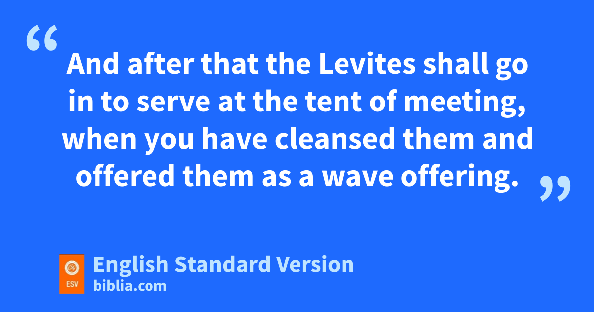 5 And the Lord spoke to Moses, saying, 6 “Take the Levites from among the people of Israel and cleanse them. 7 Thus you shall do to them to cleanse them: sprinkle the jwater of purification upon them, and klet them go with a razor over all their body, and wash their clothes and cleanse themselves. 8 Then let them take a bull from the herd and lits grain offering of fine flour mixed with oil, mand you shall take another bull from the herd for a sin offering. 9 nAnd you shall bring the Levites before the tent of meeting oand assemble the whole congregation of the people of Israel. 10 When you bring the Levites before the Lord, the people of Israel pshall lay their hands on the Levites, 11 and Aaron shall offer the Levites before the Lord as a wave offering from the people of Israel, that they may do the service of the Lord. 12 Then the Levites qshall lay their hands on the heads of the bulls, and you shall offer rthe one for a sin offering and the other for a burnt offering to the Lord to make atonement for the Levites. 13 And you shall set the Levites before Aaron and his sons, and shall offer them as sa wave offering to the Lord.
