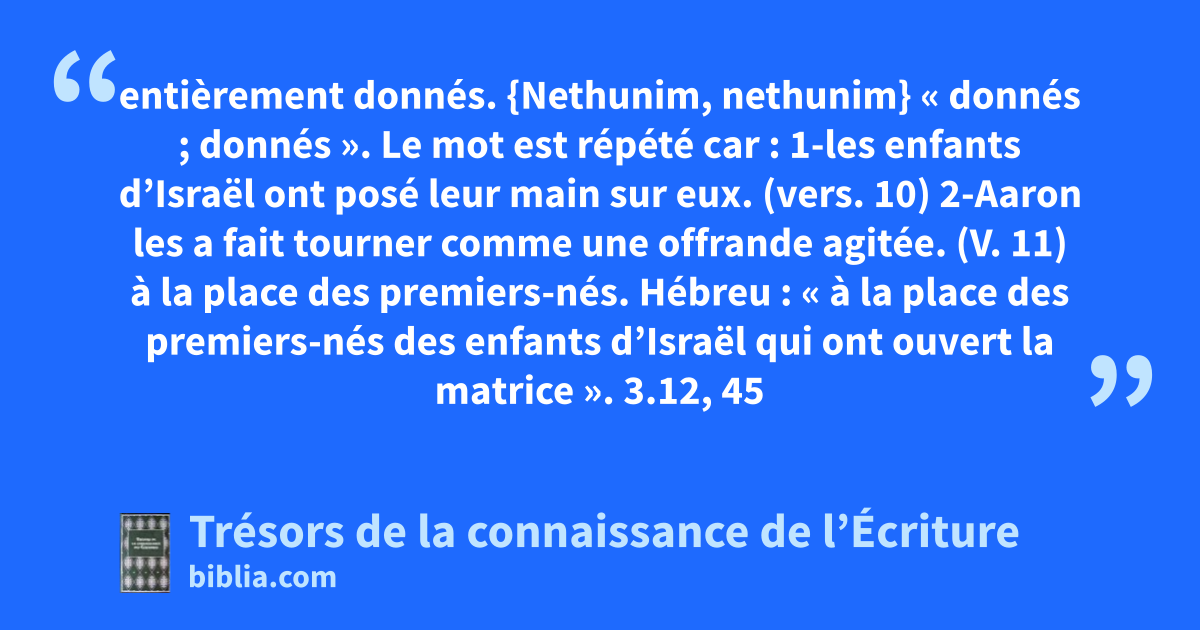 entièrement donnés. {Nethunim, nethunim} « donnés ; donnés ». Le mot est répété car : 1-les enfants d’Israël ont posé leur main sur eux. (vers. 10) 2-Aaron les a fait tourner comme une offrande agitée. (V. 11) à la place des premiers-nés. Hébreu : « à la place des premiers-nés des enfants d’Israël qui ont ouvert la matrice ». 3.12, 45