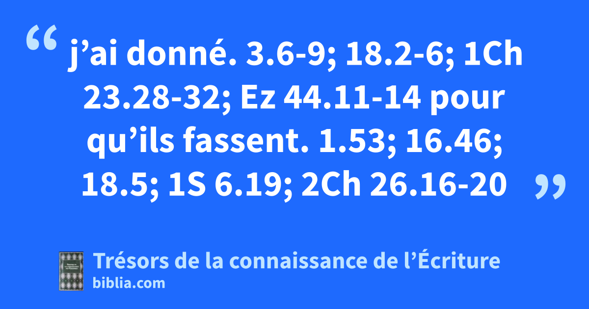 j’ai donné. 3.6-9; 18.2-6; 1Ch 23.28-32; Ez 44.11-14 pour qu’ils fassent. 1.53; 16.46; 18.5; 1S 6.19; 2Ch 26.16-20