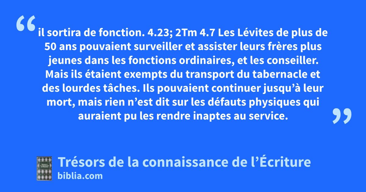 il sortira de fonction. 4.23; 2Tm 4.7 Les Lévites de plus de 50 ans pouvaient surveiller et assister leurs frères plus jeunes dans les fonctions ordinaires, et les conseiller. Mais ils étaient exempts du transport du tabernacle et des lourdes tâches. Ils pouvaient continuer jusqu’à leur mort, mais rien n’est dit sur les défauts physiques qui auraient pu les rendre inaptes au service.