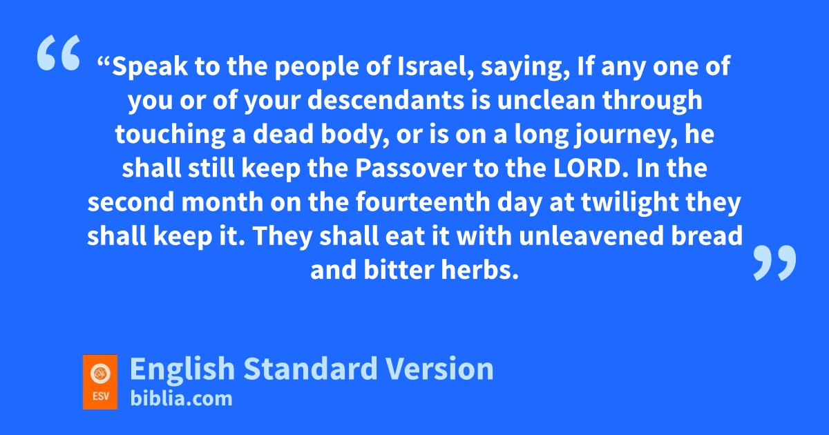 9 The Lord spoke to Moses, saying, 10 “Speak to the people of Israel, saying, If any one of you or of your descendants is unclean through touching a dead body, or is on a long journey, he shall still keep the Passover to the Lord. 11 jIn the second month on the fourteenth day at twilight they shall keep it. kThey shall eat it with unleavened bread and bitter herbs. 12 lThey shall leave none of it until the morning, mnor break any of its bones; naccording to all the statute for the Passover they shall keep it. 13 But if anyone who is clean and is not on a journey fails to keep the Passover, othat person shall be cut off from his people because he did not bring the Lord’s poffering at its appointed time; that man shall bear his sin. 14 And if a stranger sojourns among you and would keep the Passover to the Lord, according to the statute of the Passover and according to its rule, so shall he do. qYou shall have one statute, both for the sojourner and for the native.”