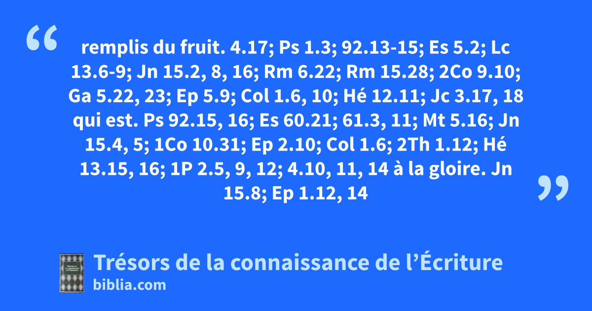 remplis du fruit. 4.17; Ps 1.3; 92.13-15; Es 5.2; Lc 13.6-9; Jn 15.2, 8, 16; Rm 6.22; Rm 15.28; 2Co 9.10; Ga 5.22, 23; Ep 5.9; Col 1.6, 10; Hé 12.11; Jc 3.17, 18 qui est. Ps 92.15, 16; Es 60.21; 61.3, 11; Mt 5.16; Jn 15.4, 5; 1Co 10.31; Ep 2.10; Col 1.6; 2Th 1.12; Hé 13.15, 16; 1P 2.5, 9, 12; 4.10, 11, 14 à la gloire. Jn 15.8; Ep 1.12, 14