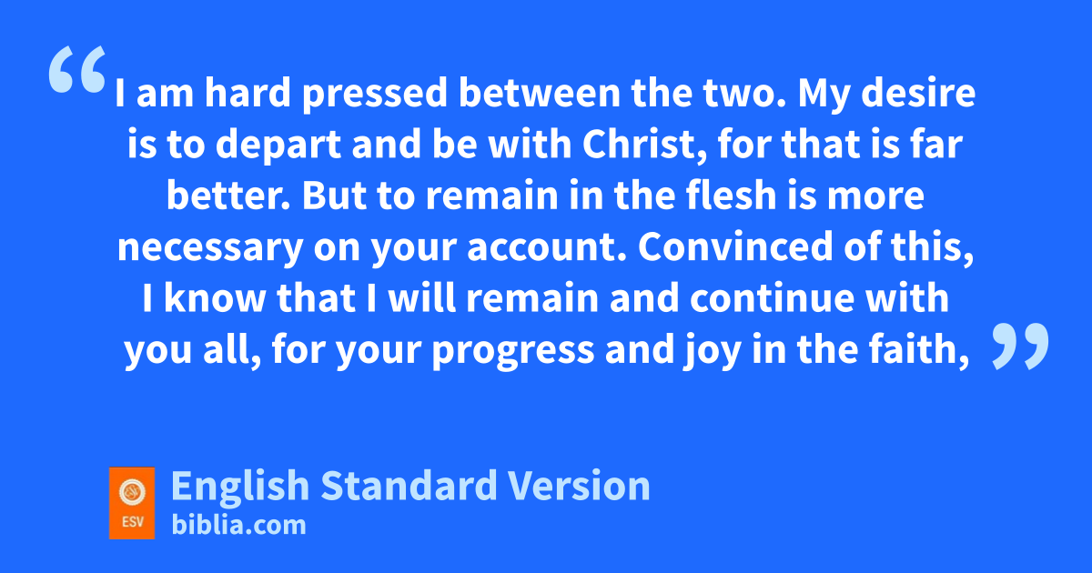 Yes, and I will rejoice, 19 for I know that fthrough your prayers and gthe help of hthe Spirit of Jesus Christ this will turn out for my deliverance, 20 as it is my eager expectation and hope ithat I will not be at all ashamed, but that with full jcourage now as always Christ kwill be honored in my body, lwhether by life or by death. 21 For to me mto live is Christ, and to die is gain. 22 If I am to live in the flesh, that means fruitful labor for me. Yet which I shall choose I cannot tell. 23 nI am hard pressed between the two. My desire is oto depart and pbe with Christ, for that is far better. 24 But to remain in the flesh is more necessary on your account. 25 qConvinced of this, rI know that I will remain and continue with you all, for your sprogress and tjoy in the faith, 26 so that in me uyou may have ample cause to glory in Christ Jesus, because of my coming to you again.
