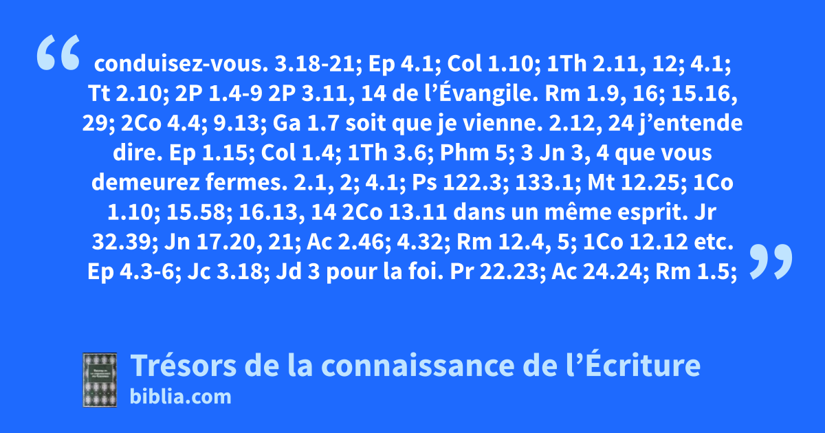 conduisez-vous. 3.18-21; Ep 4.1; Col 1.10; 1Th 2.11, 12; 4.1; Tt 2.10; 2P 1.4-9 2P 3.11, 14 de l’Évangile. Rm 1.9, 16; 15.16, 29; 2Co 4.4; 9.13; Ga 1.7 soit que je vienne. 2.12, 24 j’entende dire. Ep 1.15; Col 1.4; 1Th 3.6; Phm 5; 3 Jn 3, 4 que vous demeurez fermes. 2.1, 2; 4.1; Ps 122.3; 133.1; Mt 12.25; 1Co 1.10; 15.58; 16.13, 14 2Co 13.11 dans un même esprit. Jr 32.39; Jn 17.20, 21; Ac 2.46; 4.32; Rm 12.4, 5; 1Co 12.12 etc. Ep 4.3-6; Jc 3.18; Jd 3 pour la foi. Pr 22.23; Ac 24.24; Rm 1.5; 10.8; Ep 1.13; 1Tm 1.11, 19; 2Tm 4.7