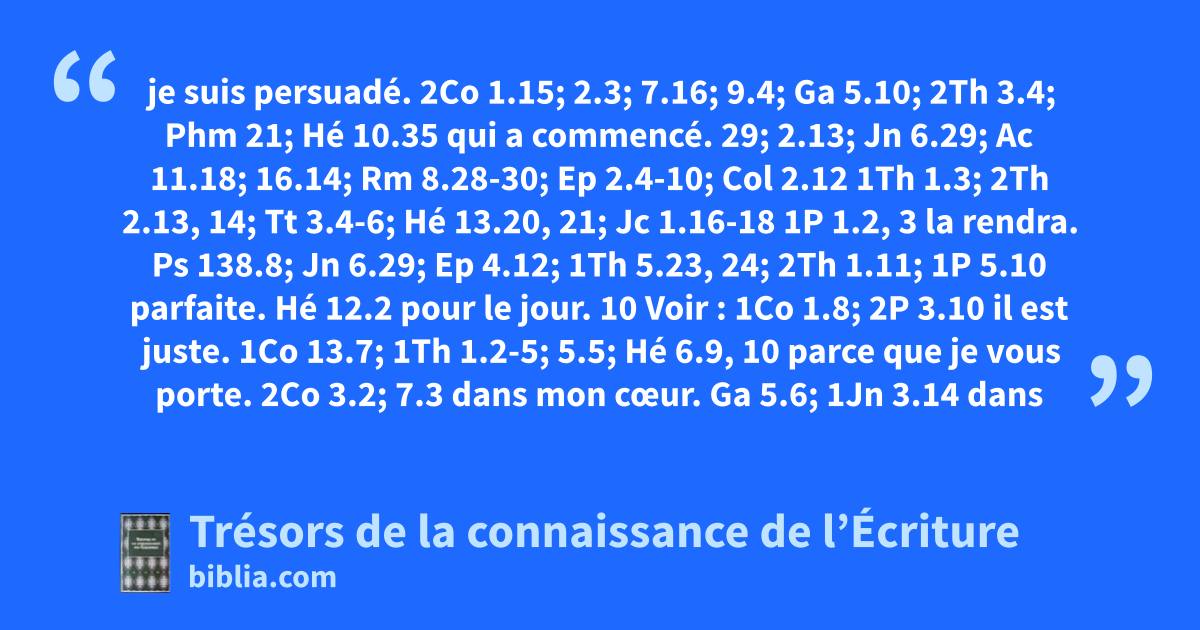 je suis persuadé. 2Co 1.15; 2.3; 7.16; 9.4; Ga 5.10; 2Th 3.4; Phm 21; Hé 10.35 qui a commencé. 29; 2.13; Jn 6.29; Ac 11.18; 16.14; Rm 8.28-30; Ep 2.4-10; Col 2.12 1Th 1.3; 2Th 2.13, 14; Tt 3.4-6; Hé 13.20, 21; Jc 1.16-18 1P 1.2, 3 la rendra. Ps 138.8; Jn 6.29; Ep 4.12; 1Th 5.23, 24; 2Th 1.11; 1P 5.10 parfaite. Hé 12.2 pour le jour. 10 Voir : 1Co 1.8; 2P 3.10
