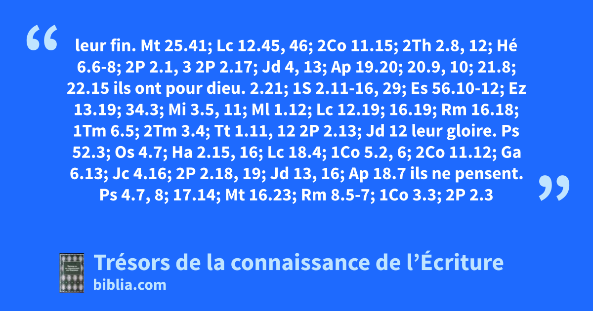 leur fin. Mt 25.41; Lc 12.45, 46; 2Co 11.15; 2Th 2.8, 12; Hé 6.6-8; 2P 2.1, 3 2P 2.17; Jd 4, 13; Ap 19.20; 20.9, 10; 21.8; 22.15 ils ont pour dieu. 2.21; 1S 2.11-16, 29; Es 56.10-12; Ez 13.19; 34.3; Mi 3.5, 11; Ml 1.12; Lc 12.19; 16.19; Rm 16.18; 1Tm 6.5; 2Tm 3.4; Tt 1.11, 12 2P 2.13; Jd 12 leur gloire. Ps 52.3; Os 4.7; Ha 2.15, 16; Lc 18.4; 1Co 5.2, 6; 2Co 11.12; Ga 6.13; Jc 4.16; 2P 2.18, 19; Jd 13, 16; Ap 18.7 ils ne pensent. Ps 4.7, 8; 17.14; Mt 16.23; Rm 8.5-7; 1Co 3.3; 2P 2.3
