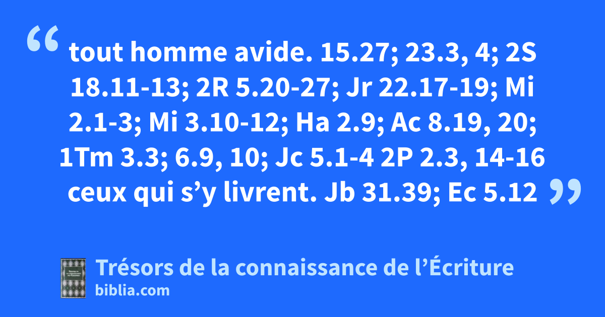 tout homme avide. 15.27; 23.3, 4; 2S 18.11-13; 2R 5.20-27; Jr 22.17-19; Mi 2.1-3; Mi 3.10-12; Ha 2.9; Ac 8.19, 20; 1Tm 3.3; 6.9, 10; Jc 5.1-4 2P 2.3, 14-16 ceux qui s’y livrent. Jb 31.39; Ec 5.12