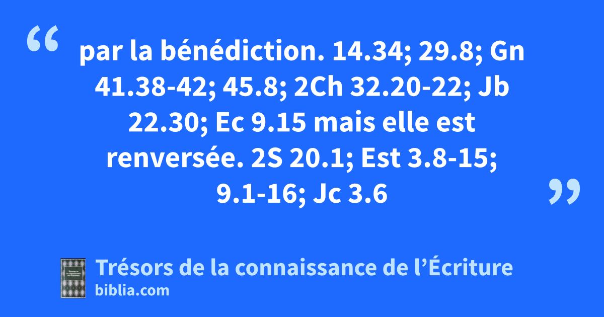 par la bénédiction. 14.34; 29.8; Gn 41.38-42; 45.8; 2Ch 32.20-22; Jb 22.30; Ec 9.15 mais elle est renversée. 2S 20.1; Est 3.8-15; 9.1-16; Jc 3.6