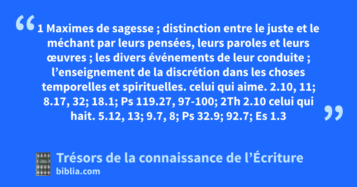 1 Maximes de sagesse ; distinction entre le juste et le méchant par leurs pensées, leurs paroles et leurs œuvres ; les divers événements de leur conduite ; l’enseignement de la discrétion dans les choses temporelles et spirituelles.