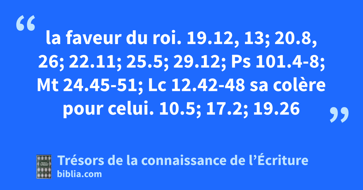 la faveur du roi. 19.12, 13; 20.8, 26; 22.11; 25.5; 29.12; Ps 101.4-8; Mt 24.45-51; Lc 12.42-48 sa colère pour celui. 10.5; 17.2; 19.26