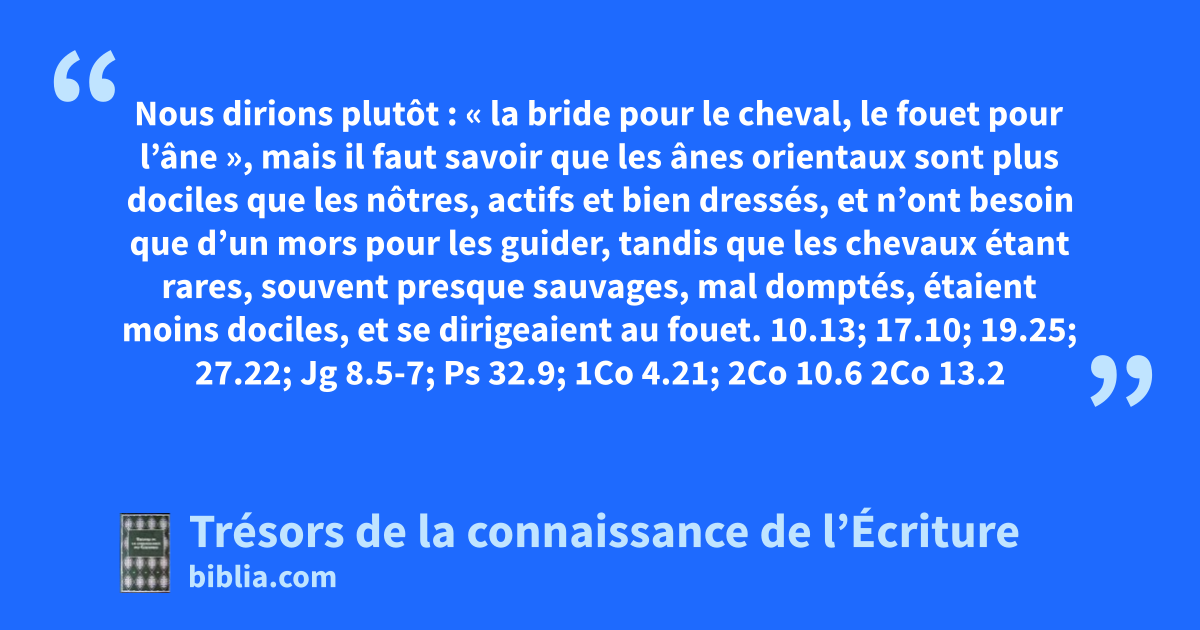 Nous dirions plutôt : « la bride pour le cheval, le fouet pour l’âne », mais il faut savoir que les ânes orientaux sont plus dociles que les nôtres, actifs et bien dressés, et n’ont besoin que d’un mors pour les guider, tandis que les chevaux étant rares, souvent presque sauvages, mal domptés, étaient moins dociles, et se dirigeaient au fouet. 10.13; 17.10; 19.25; 27.22; Jg 8.5-7; Ps 32.9; 1Co 4.21; 2Co 10.6 2Co 13.2