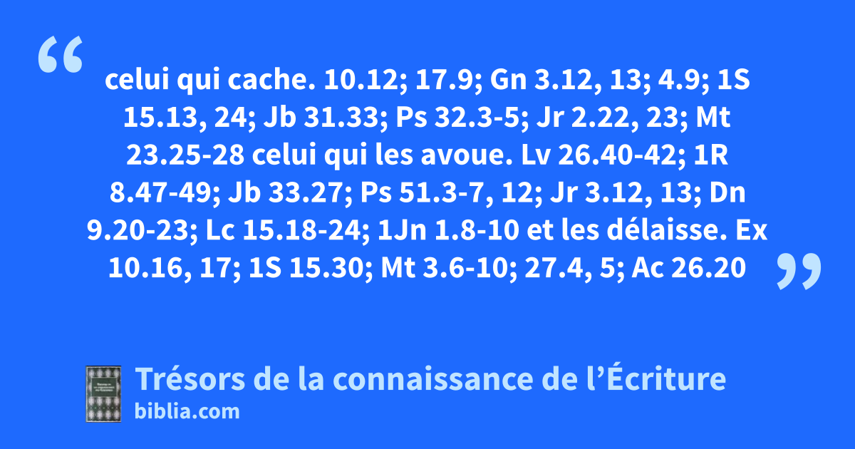 celui qui cache. 10.12; 17.9; Gn 3.12, 13; 4.9; 1S 15.13, 24; Jb 31.33; Ps 32.3-5; Jr 2.22, 23; Mt 23.25-28 celui qui les avoue. Lv 26.40-42; 1R 8.47-49; Jb 33.27; Ps 51.3-7, 12; Jr 3.12, 13; Dn 9.20-23; Lc 15.18-24; 1Jn 1.8-10 et les délaisse. Ex 10.16, 17; 1S 15.30; Mt 3.6-10; 27.4, 5; Ac 26.20