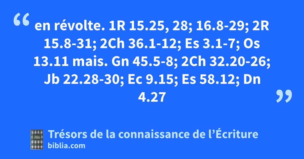 en révolte. 1R 15.25, 28; 16.8-29; 2R 15.8-31; 2Ch 36.1-12; Es 3.1-7; Os 13.11 mais. Gn 45.5-8; 2Ch 32.20-26; Jb 22.28-30; Ec 9.15; Es 58.12; Dn 4.27