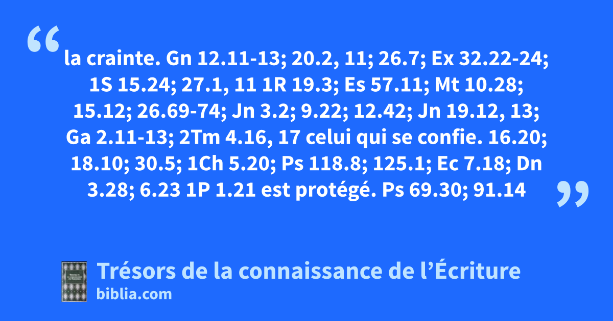 la crainte. Gn 12.11-13; 20.2, 11; 26.7; Ex 32.22-24; 1S 15.24; 27.1, 11 1R 19.3; Es 57.11; Mt 10.28; 15.12; 26.69-74; Jn 3.2; 9.22; 12.42; Jn 19.12, 13; Ga 2.11-13; 2Tm 4.16, 17 celui qui se confie. 16.20; 18.10; 30.5; 1Ch 5.20; Ps 118.8; 125.1; Ec 7.18; Dn 3.28; 6.23 1P 1.21 est protégé. Ps 69.30; 91.14