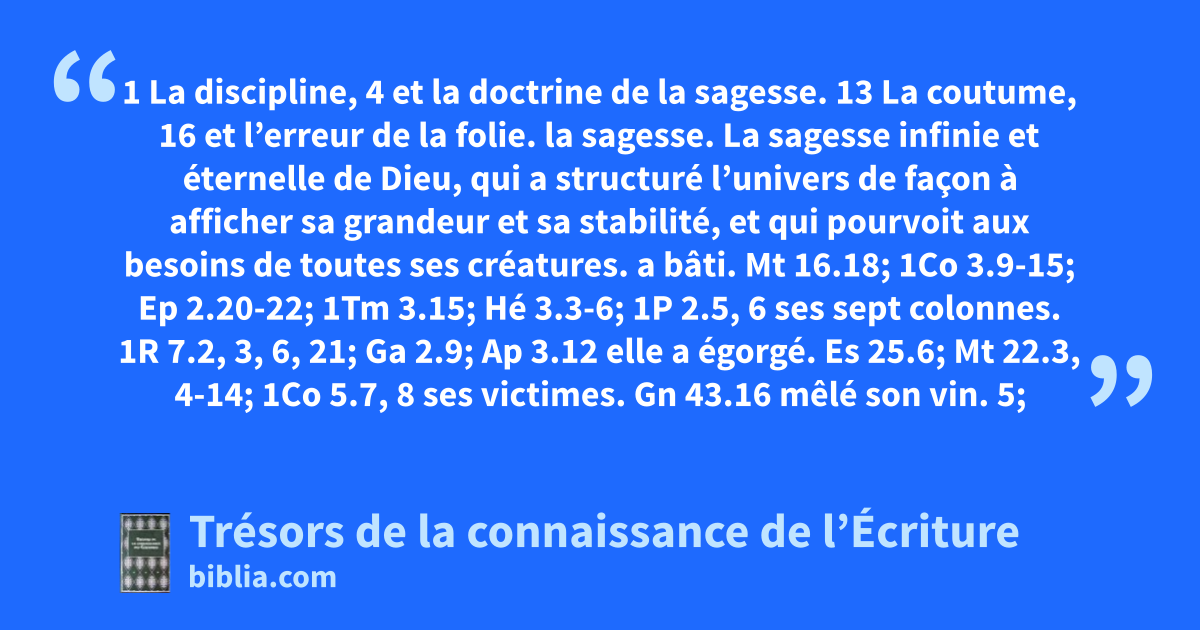 la sagesse. La sagesse infinie et éternelle de Dieu, qui a structuré l’univers de façon à afficher sa grandeur et sa stabilité, et qui pourvoit aux besoins de toutes ses créatures. a bâti. Mt 16.18; 1Co 3.9-15; Ep 2.20-22; 1Tm 3.15; Hé 3.3-6; 1P 2.5, 6 ses sept colonnes. 1R 7.2, 3, 6, 21; Ga 2.9; Ap 3.12