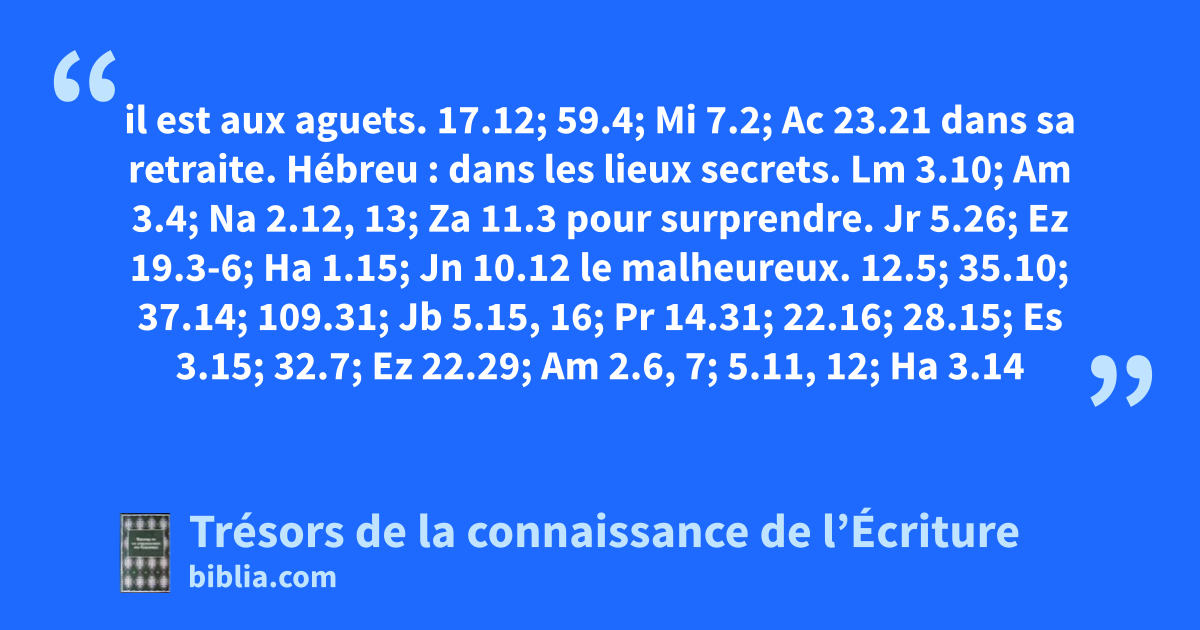 il est aux aguets. 17.12; 59.4; Mi 7.2; Ac 23.21 dans sa retraite. Hébreu : dans les lieux secrets. Lm 3.10; Am 3.4; Na 2.12, 13; Za 11.3 pour surprendre. Jr 5.26; Ez 19.3-6; Ha 1.15; Jn 10.12 le malheureux. 12.5; 35.10; 37.14; 109.31; Jb 5.15, 16; Pr 14.31; 22.16; 28.15; Es 3.15; 32.7; Ez 22.29; Am 2.6, 7; 5.11, 12; Ha 3.14