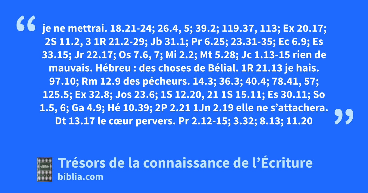 je ne mettrai. 18.21-24; 26.4, 5; 39.2; 119.37, 113; Ex 20.17; 2S 11.2, 3 1R 21.2-29; Jb 31.1; Pr 6.25; 23.31-35; Ec 6.9; Es 33.15; Jr 22.17; Os 7.6, 7; Mi 2.2; Mt 5.28; Jc 1.13-15 rien de mauvais. Hébreu : des choses de Bélial. 1R 21.13 je hais. 97.10; Rm 12.9 des pécheurs. 14.3; 36.3; 40.4; 78.41, 57; 125.5; Ex 32.8; Jos 23.6; 1S 12.20, 21 1S 15.11; Es 30.11; So 1.5, 6; Ga 4.9; Hé 10.39; 2P 2.21 1Jn 2.19 elle ne s’attachera. Dt 13.17