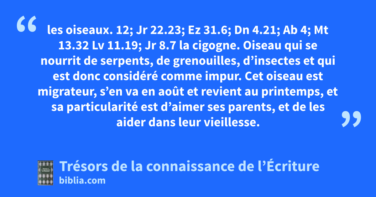 les oiseaux. 12; Jr 22.23; Ez 31.6; Dn 4.21; Ab 4; Mt 13.32 Lv 11.19; Jr 8.7 la cigogne. Oiseau qui se nourrit de serpents, de grenouilles, d’insectes et qui est donc considéré comme impur. Cet oiseau est migrateur, s’en va en août et revient au printemps, et sa particularité est d’aimer ses parents, et de les aider dans leur vieillesse.