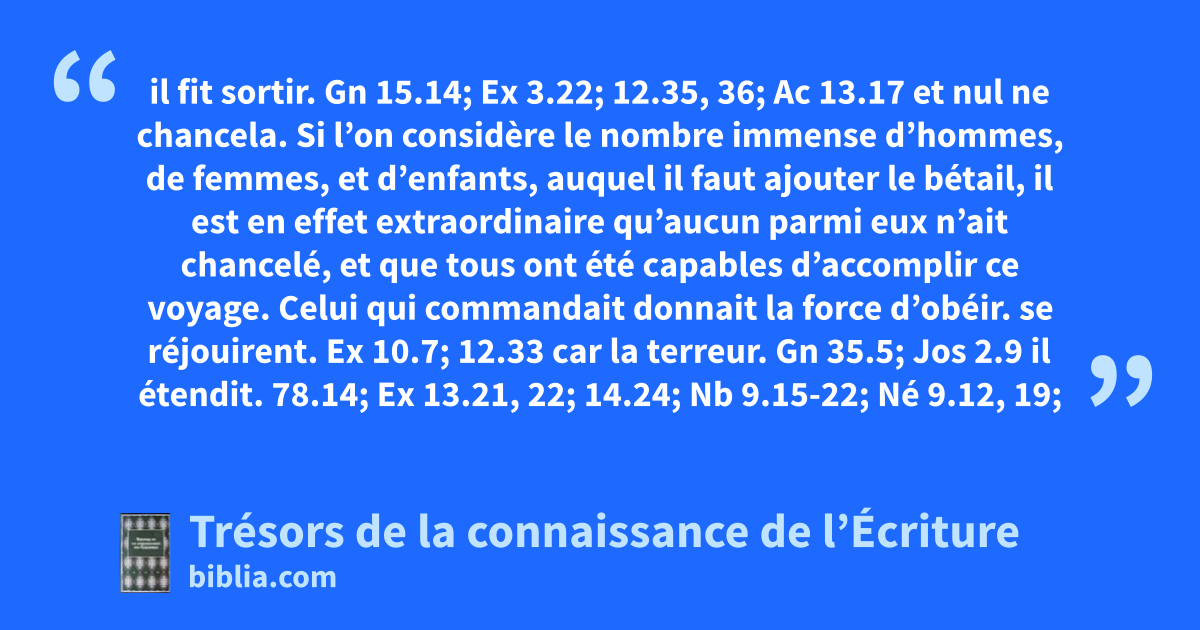 il fit sortir. Gn 15.14; Ex 3.22; 12.35, 36; Ac 13.17 et nul ne chancela. Si l’on considère le nombre immense d’hommes, de femmes, et d’enfants, auquel il faut ajouter le bétail, il est en effet extraordinaire qu’aucun parmi eux n’ait chancelé, et que tous ont été capables d’accomplir ce voyage. Celui qui commandait donnait la force d’obéir.