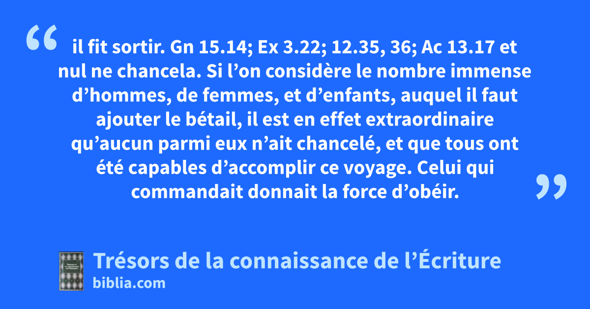 il fit sortir. Gn 15.14; Ex 3.22; 12.35, 36; Ac 13.17 et nul ne chancela. Si l’on considère le nombre immense d’hommes, de femmes, et d’enfants, auquel il faut ajouter le bétail, il est en effet extraordinaire qu’aucun parmi eux n’ait chancelé, et que tous ont été capables d’accomplir ce voyage. Celui qui commandait donnait la force d’obéir.