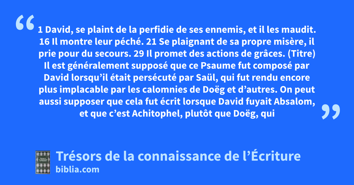 (Titre) Il est généralement supposé que ce Psaume fut composé par David lorsqu’il était persécuté par Saül, qui fut rendu encore plus implacable par les calomnies de Doëg et d’autres. On peut aussi supposer que cela fut écrit lorsque David fuyait Absalom, et que c’est Achitophel, plutôt que Doëg, qui est ici la personne visée. Dieu de ma louange. 118.28; Ex 15.2; Dt 10.21; Jr 17.14 ne te tais point. 28.1; 35.22, 23; 83.1; Es 42.14