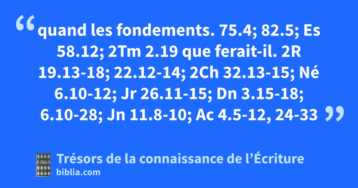 quand les fondements. 75.4; 82.5; Es 58.12; 2Tm 2.19 que ferait-il. 2R 19.13-18; 22.12-14; 2Ch 32.13-15; Né 6.10-12; Jr 26.11-15; Dn 3.15-18; 6.10-28; Jn 11.8-10; Ac 4.5-12, 24-33