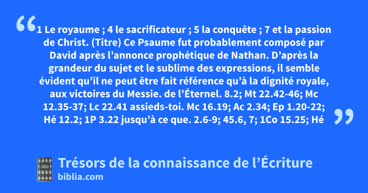 (Titre) Ce Psaume fut probablement composé par David après l’annonce prophétique de Nathan. D’après la grandeur du sujet et le sublime des expressions, il semble évident qu’il ne peut être fait référence qu’à la dignité royale, aux victoires du Messie. de l’Éternel. 8.2; Mt 22.42-46; Mc 12.35-37; Lc 22.41 assieds-toi. Mc 16.19; Ac 2.34; Ep 1.20-22; Hé 12.2; 1P 3.22 jusqu’à ce que. 2.6-9; 45.6, 7; 1Co 15.25; Hé 1.3, 13; 10.12, 13