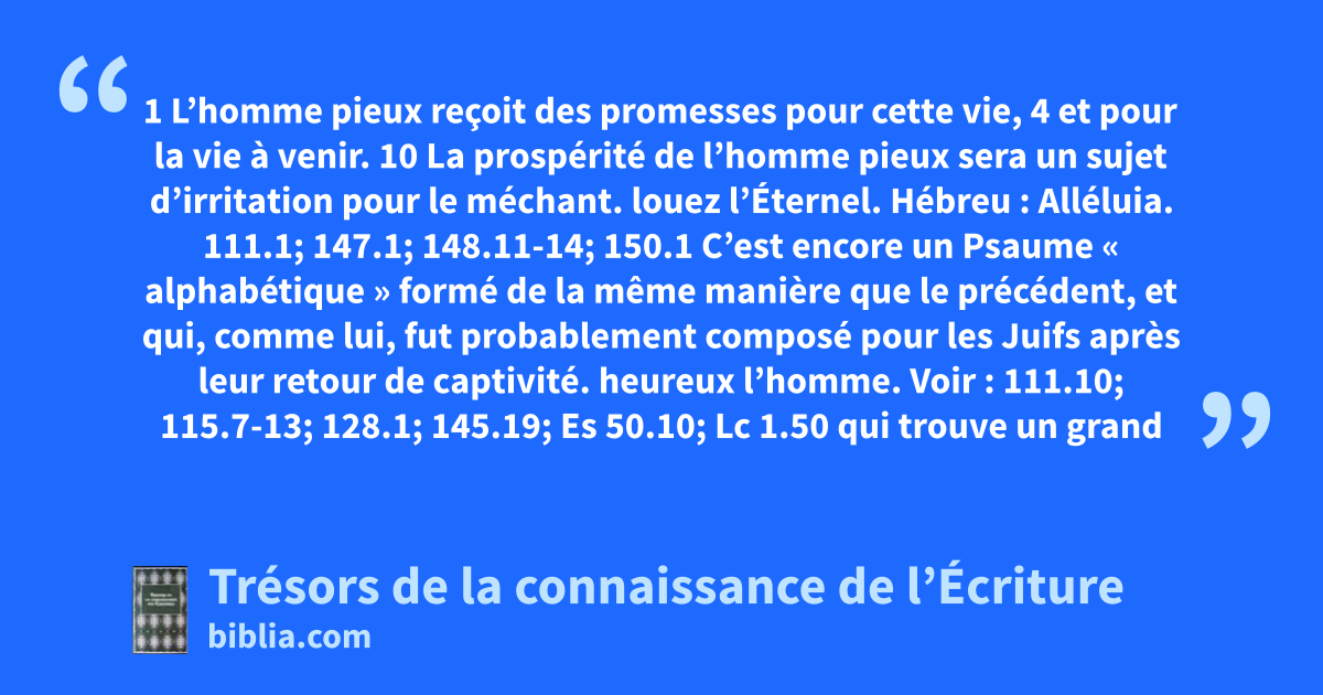 louez l’Éternel. Hébreu : Alléluia. 111.1; 147.1; 148.11-14; 150.1 C’est encore un Psaume « alphabétique » formé de la même manière que le précédent, et qui, comme lui, fut probablement composé pour les Juifs après leur retour de captivité. heureux l’homme. Voir : 111.10; 115.7-13; 128.1; 145.19; Es 50.10; Lc 1.50 qui trouve un grand plaisir. 1.1, 2; 40.8; 119.16, 35, 47, 48, 70-72, 97, 143; Rm 7.22; 8.6