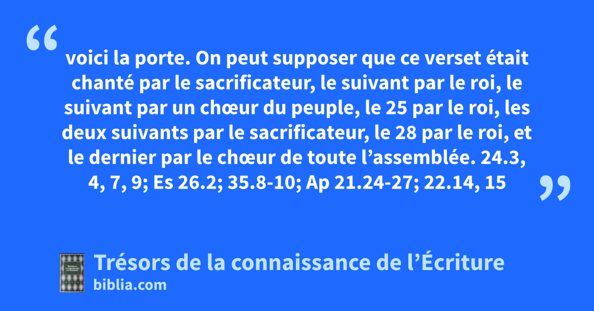 voici la porte. On peut supposer que ce verset était chanté par le sacrificateur, le suivant par le roi, le suivant par un chœur du peuple, le 25 par le roi, les deux suivants par le sacrificateur, le 28 par le roi, et le dernier par le chœur de toute l’assemblée. 24.3, 4, 7, 9; Es 26.2; 35.8-10; Ap 21.24-27; 22.14, 15