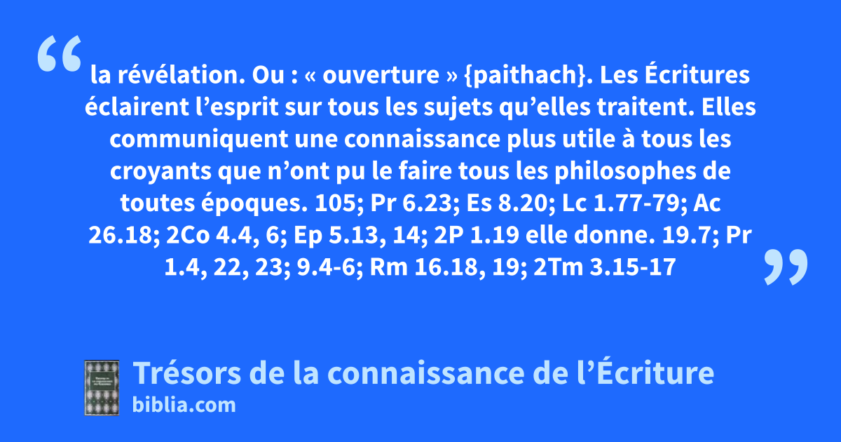 la révélation. Ou : « ouverture » {paithach}. Les Écritures éclairent l’esprit sur tous les sujets qu’elles traitent. Elles communiquent une connaissance plus utile à tous les croyants que n’ont pu le faire tous les philosophes de toutes époques. 105; Pr 6.23; Es 8.20; Lc 1.77-79; Ac 26.18; 2Co 4.4, 6; Ep 5.13, 14; 2P 1.19 elle donne. 19.7; Pr 1.4, 22, 23; 9.4-6; Rm 16.18, 19; 2Tm 3.15-17