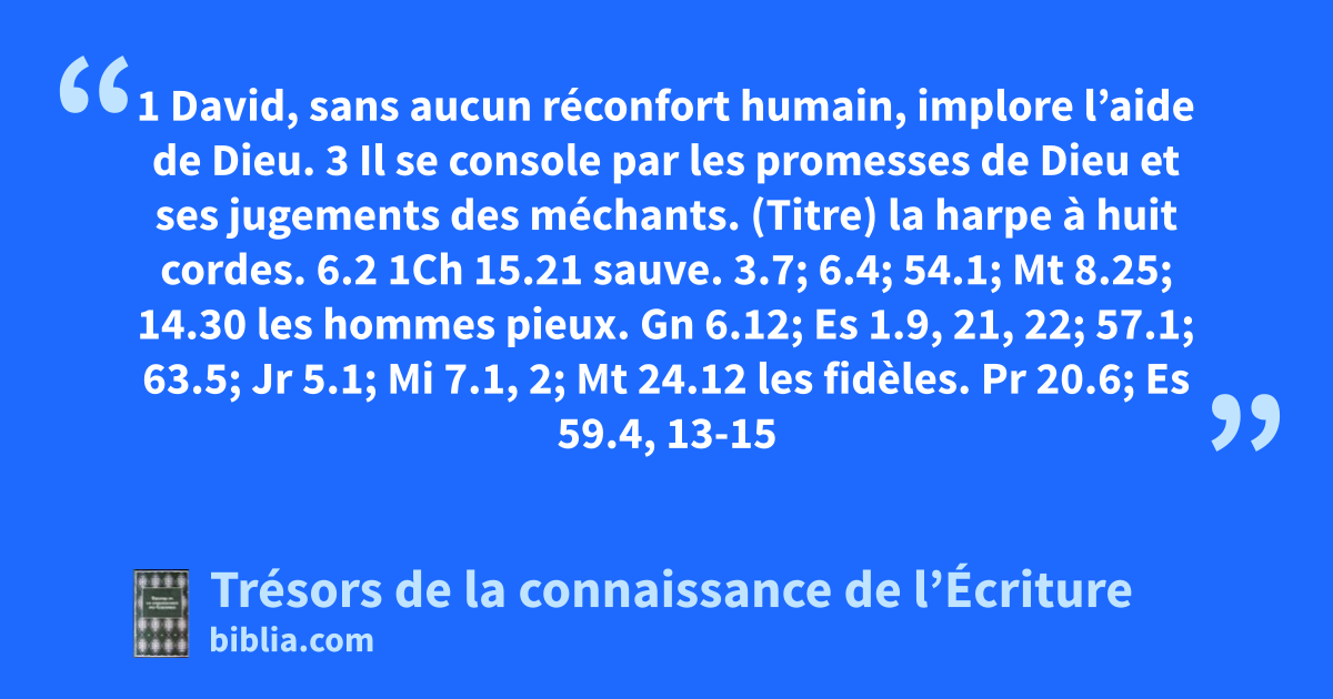 (Titre) la harpe à huit cordes. 6.2 1Ch 15.21 sauve. 3.7; 6.4; 54.1; Mt 8.25; 14.30 les hommes pieux. Gn 6.12; Es 1.9, 21, 22; 57.1; 63.5; Jr 5.1; Mi 7.1, 2; Mt 24.12 les fidèles. Pr 20.6; Es 59.4, 13-15