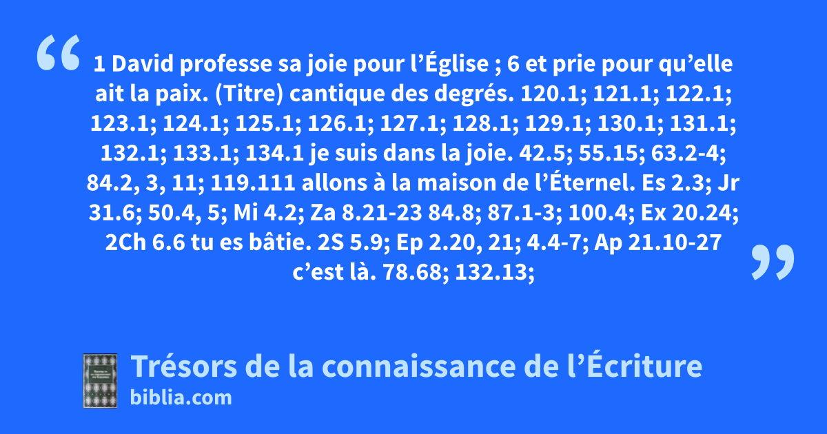 (Titre) cantique des degrés. 120.1; 121.1; 122.1; 123.1; 124.1; 125.1; 126.1; 127.1; 128.1; 129.1; 130.1; 131.1; 132.1; 133.1; 134.1 je suis dans la joie. 42.5; 55.15; 63.2-4; 84.2, 3, 11; 119.111 allons à la maison de l’Éternel. Es 2.3; Jr 31.6; 50.4, 5; Mi 4.2; Za 8.21-23