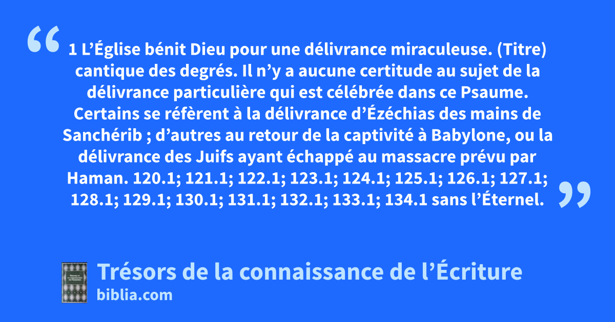 (Titre) cantique des degrés. Il n’y a aucune certitude au sujet de la délivrance particulière qui est célébrée dans ce Psaume. Certains se réfèrent à la délivrance d’Ézéchias des mains de Sanchérib ; d’autres au retour de la captivité à Babylone, ou la délivrance des Juifs ayant échappé au massacre prévu par Haman. 120.1; 121.1; 122.1; 123.1; 124.1; 125.1; 126.1; 127.1; 128.1; 129.1; 130.1; 131.1; 132.1; 133.1; 134.1 sans l’Éternel. 27.1; 46.8, 12; 54.6; 56.10; 118.6, 7; Ex 15.1; Es 8.9, 10; Rm 8.31; Hé 13.5, 6 qu’Israël le dise. 129.1