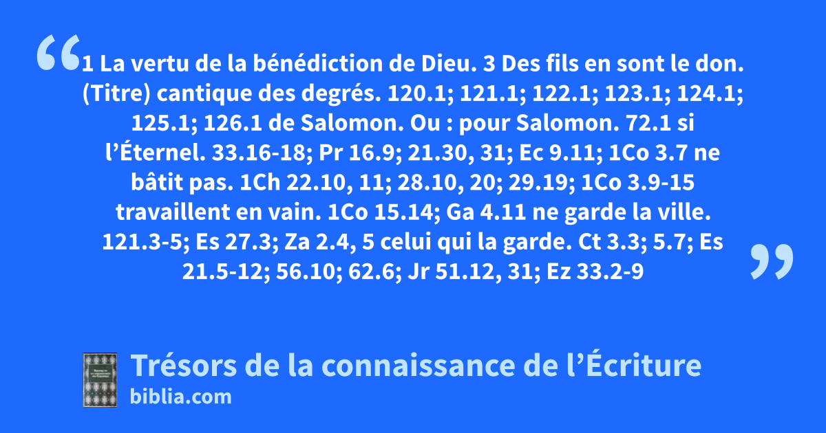 (Titre) cantique des degrés. 120.1; 121.1; 122.1; 123.1; 124.1; 125.1; 126.1 de Salomon. Ou : pour Salomon. 72.1 si l’Éternel. 33.16-18; Pr 16.9; 21.30, 31; Ec 9.11; 1Co 3.7 ne bâtit pas. 1Ch 22.10, 11; 28.10, 20; 29.19; 1Co 3.9-15 travaillent en vain. 1Co 15.14; Ga 4.11 ne garde la ville. 121.3-5; Es 27.3; Za 2.4, 5 celui qui la garde. Ct 3.3; 5.7; Es 21.5-12; 56.10; 62.6; Jr 51.12, 31; Ez 33.2-9