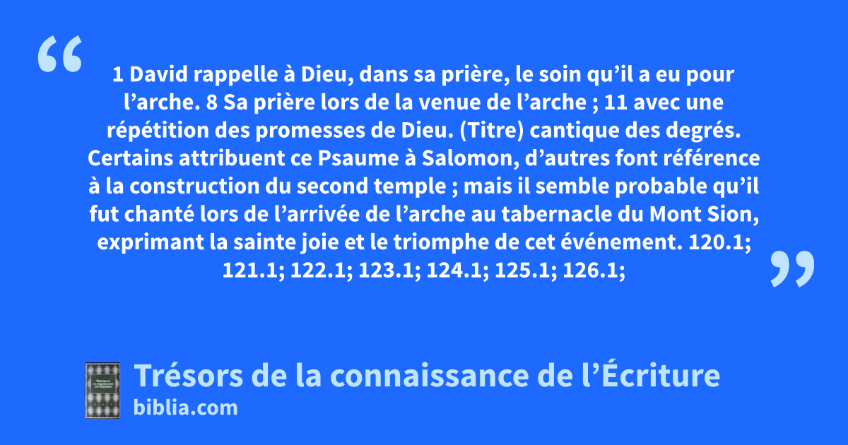 (Titre) cantique des degrés. Certains attribuent ce Psaume à Salomon, d’autres font référence à la construction du second temple ; mais il semble probable qu’il fut chanté lors de l’arrivée de l’arche au tabernacle du Mont Sion, exprimant la sainte joie et le triomphe de cet événement. 120.1; 121.1; 122.1; 123.1; 124.1; 125.1; 126.1; 127.1; 128.1; 129.1; 130.1; 131.1 souviens-toi. 25.6, 7; Gn 8.1; Ex 2.24; Lm 3.19; 5.1 de toutes ses peines. 1S 18.1-30.31; 2S 15.1-20.26
