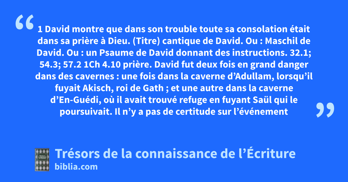 (Titre) cantique de David. Ou : Maschil de David. Ou : un Psaume de David donnant des instructions. 32.1; 54.3; 57.2 1Ch 4.10 prière. David fut deux fois en grand danger dans des cavernes : une fois dans la caverne d’Adullam, lorsqu’il fuyait Akisch, roi de Gath ; et une autre dans la caverne d’En-Guédi, où il avait trouvé refuge en fuyant Saül qui le poursuivait. Il n’y a pas de certitude sur l’événement que ce Psaume concerne, mais c’est peut-être le premier. lorsqu’il était. 1S 22.1, 2; 24.4; Hé 11.38 de ma voix. 28.2; 77.1, 2; 141.1