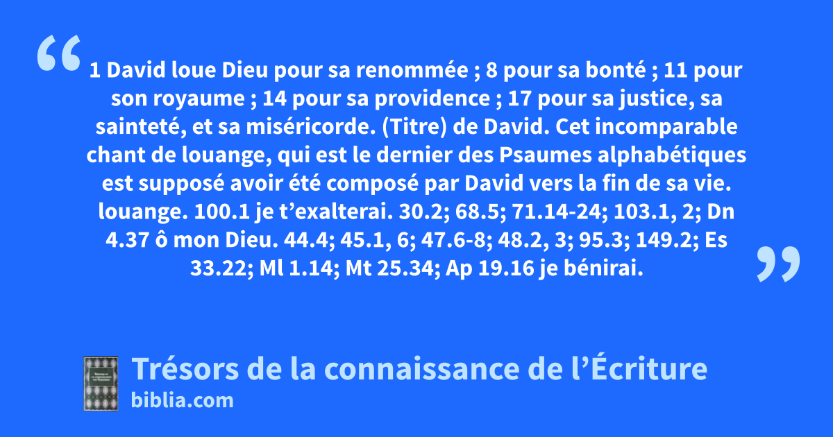 (Titre) de David. Cet incomparable chant de louange, qui est le dernier des Psaumes alphabétiques est supposé avoir été composé par David vers la fin de sa vie. louange. 100.1 je t’exalterai. 30.2; 68.5; 71.14-24; 103.1, 2; Dn 4.37 ô mon Dieu. 44.4; 45.1, 6; 47.6-8; 48.2, 3; 95.3; 149.2; Es 33.22; Ml 1.14; Mt 25.34; Ap 19.16 je bénirai. 21; 30.12; 52.9; 113.1, 2; 146.1, 2