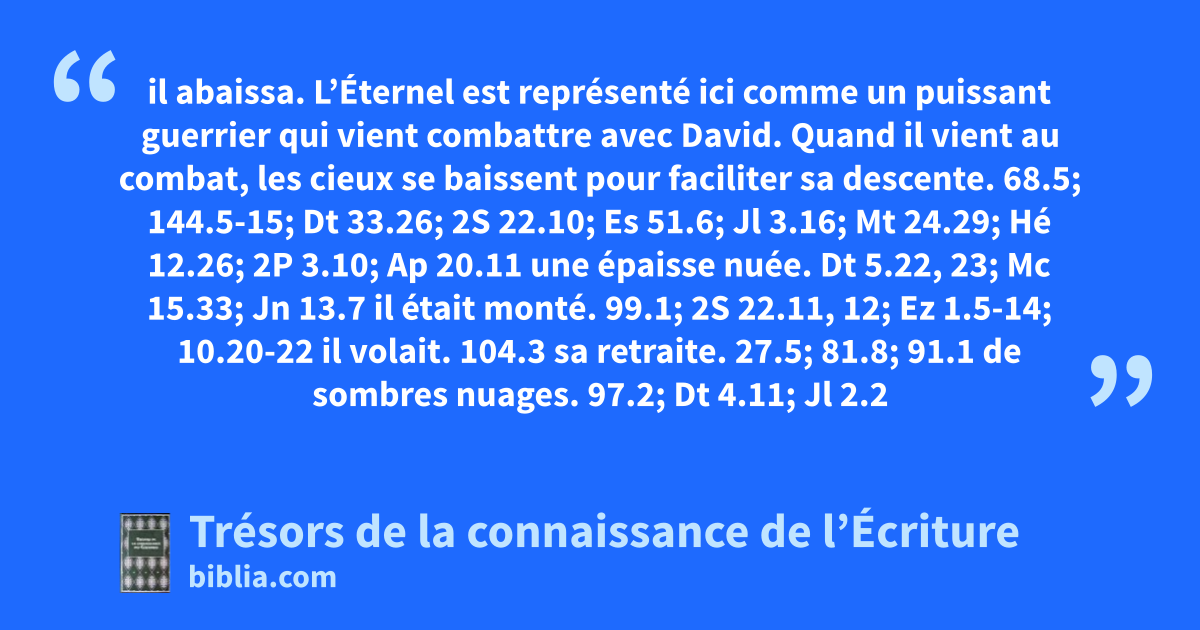 il abaissa. L’Éternel est représenté ici comme un puissant guerrier qui vient combattre avec David. Quand il vient au combat, les cieux se baissent pour faciliter sa descente. 68.5; 144.5-15; Dt 33.26; 2S 22.10; Es 51.6; Jl 3.16; Mt 24.29; Hé 12.26; 2P 3.10; Ap 20.11 une épaisse nuée. Dt 5.22, 23; Mc 15.33; Jn 13.7