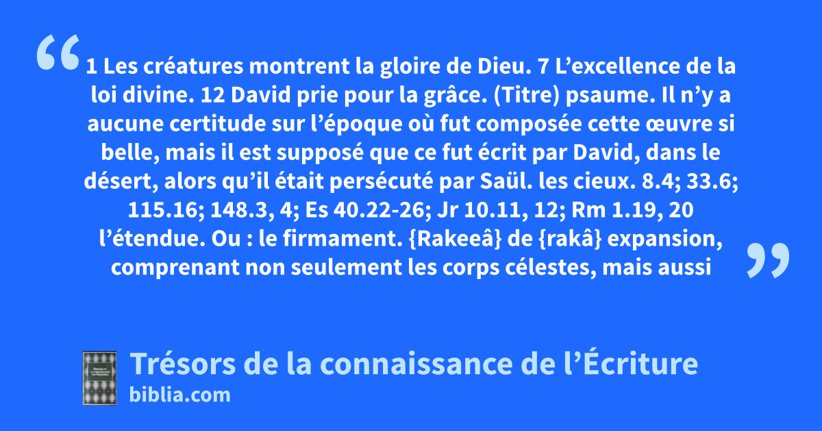 (Titre) psaume. Il n’y a aucune certitude sur l’époque où fut composée cette œuvre si belle, mais il est supposé que ce fut écrit par David, dans le désert, alors qu’il était persécuté par Saül. les cieux. 8.4; 33.6; 115.16; 148.3, 4; Es 40.22-26; Jr 10.11, 12; Rm 1.19, 20 l’étendue. Ou : le firmament. {Rakeeâ} de {rakâ} expansion, comprenant non seulement les corps célestes, mais aussi l’air, la lumière, la pluie, la rosée, etc., tout ce qui affiche l’infinie puissance et la sagesse du Tout-Puissant Créateur. 150.1, 2; Gn 1.6-8, 14, 15; Dn 12.3