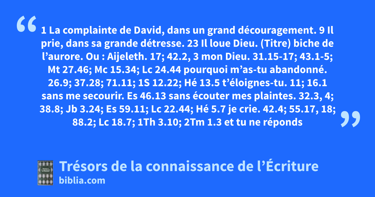 (Titre) biche de l’aurore. Ou : Aijeleth. 17; 42.2, 3 mon Dieu. 31.15-17; 43.1-5; Mt 27.46; Mc 15.34; Lc 24.44 pourquoi m’as-tu abandonné. 26.9; 37.28; 71.11; 1S 12.22; Hé 13.5 t’éloignes-tu. 11; 16.1 sans me secourir. Es 46.13 sans écouter mes plaintes. 32.3, 4; 38.8; Jb 3.24; Es 59.11; Lc 22.44; Hé 5.7
