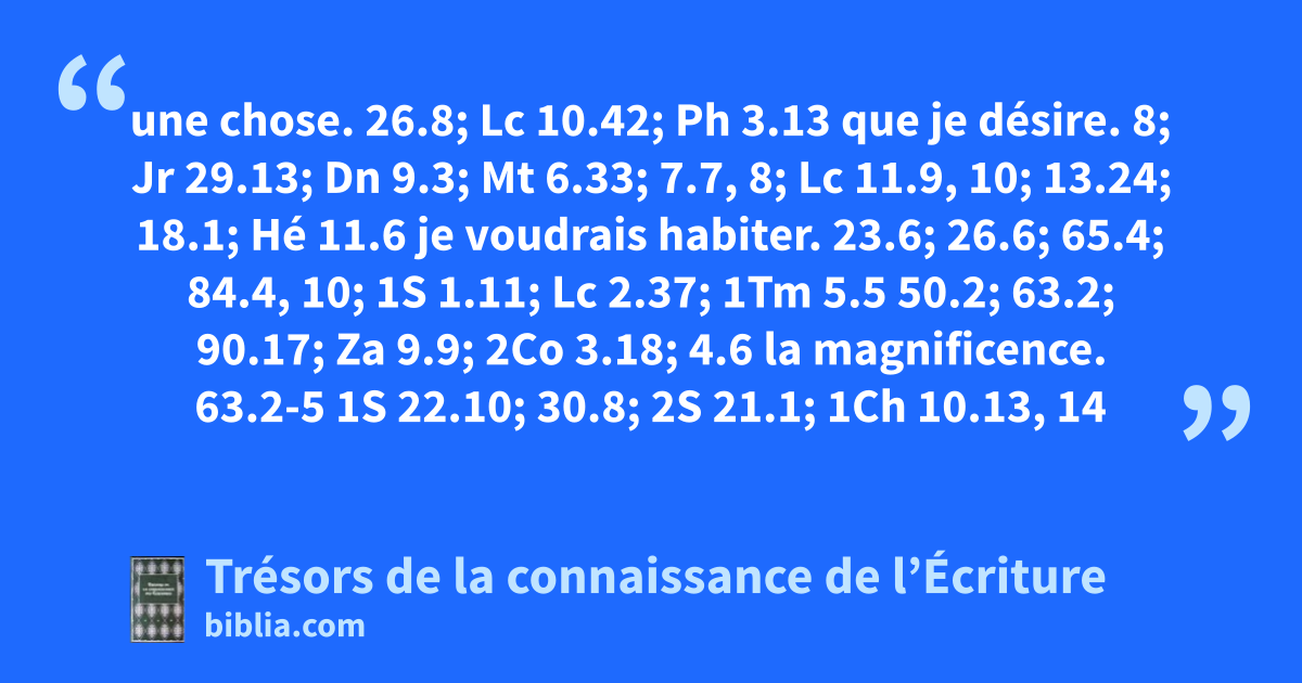 une chose. 26.8; Lc 10.42; Ph 3.13 que je désire. 8; Jr 29.13; Dn 9.3; Mt 6.33; 7.7, 8; Lc 11.9, 10; 13.24; 18.1; Hé 11.6 je voudrais habiter. 23.6; 26.6; 65.4; 84.4, 10; 1S 1.11; Lc 2.37; 1Tm 5.5 50.2; 63.2; 90.17; Za 9.9; 2Co 3.18; 4.6 la magnificence. 63.2-5 1S 22.10; 30.8; 2S 21.1; 1Ch 10.13, 14