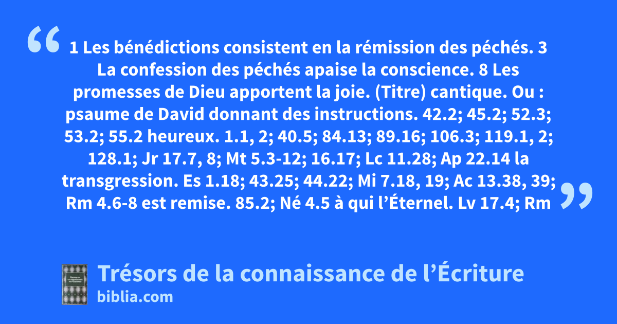 (Titre) cantique. Ou : psaume de David donnant des instructions. 42.2; 45.2; 52.3; 53.2; 55.2 heureux. 1.1, 2; 40.5; 84.13; 89.16; 106.3; 119.1, 2; 128.1; Jr 17.7, 8; Mt 5.3-12; 16.17; Lc 11.28; Ap 22.14 la transgression. Es 1.18; 43.25; 44.22; Mi 7.18, 19; Ac 13.38, 39; Rm 4.6-8 est remise. 85.2; Né 4.5