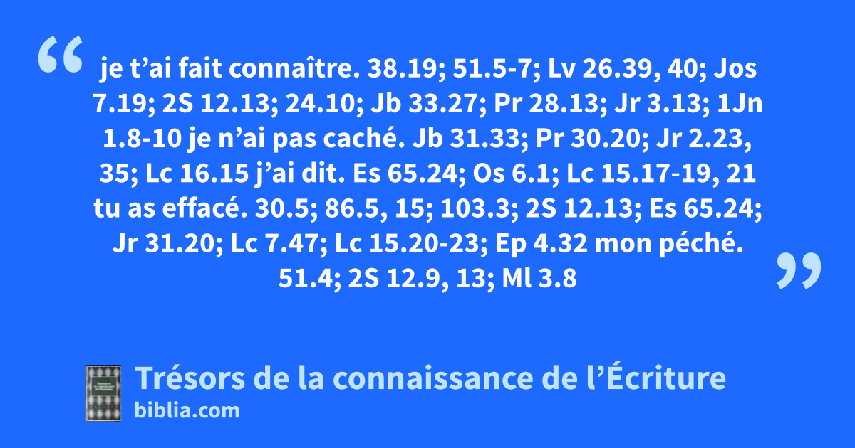 je t’ai fait connaître. 38.19; 51.5-7; Lv 26.39, 40; Jos 7.19; 2S 12.13; 24.10; Jb 33.27; Pr 28.13; Jr 3.13; 1Jn 1.8-10 je n’ai pas caché. Jb 31.33; Pr 30.20; Jr 2.23, 35; Lc 16.15 j’ai dit. Es 65.24; Os 6.1; Lc 15.17-19, 21 tu as effacé. 30.5; 86.5, 15; 103.3; 2S 12.13; Es 65.24; Jr 31.20; Lc 7.47; Lc 15.20-23; Ep 4.32 mon péché. 51.4; 2S 12.9, 13; Ml 3.8