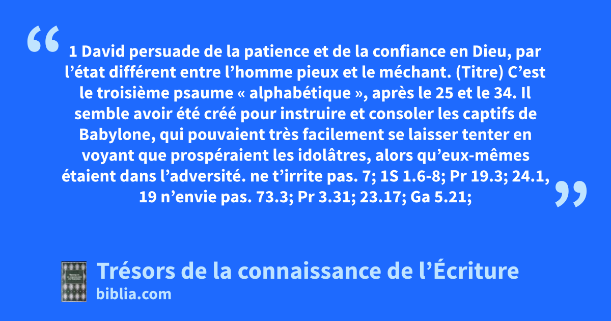 (Titre) C’est le troisième psaume « alphabétique », après le 25 et le 34. Il semble avoir été créé pour instruire et consoler les captifs de Babylone, qui pouvaient très facilement se laisser tenter en voyant que prospéraient les idolâtres, alors qu’eux-mêmes étaient dans l’adversité. ne t’irrite pas. 7; 1S 1.6-8; Pr 19.3; 24.1, 19 n’envie pas. 73.3; Pr 3.31; 23.17; Ga 5.21; Jc 4.5, 6