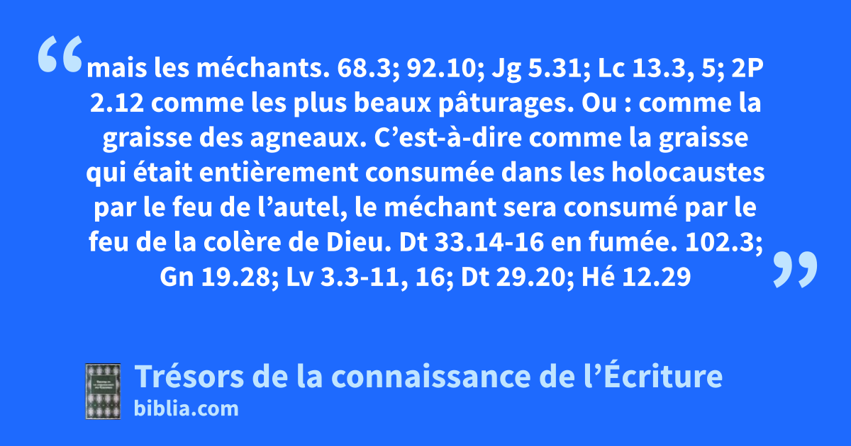 mais les méchants. 68.3; 92.10; Jg 5.31; Lc 13.3, 5; 2P 2.12 comme les plus beaux pâturages. Ou : comme la graisse des agneaux. C’est-à-dire comme la graisse qui était entièrement consumée dans les holocaustes par le feu de l’autel, le méchant sera consumé par le feu de la colère de Dieu. Dt 33.14-16 en fumée. 102.3; Gn 19.28; Lv 3.3-11, 16; Dt 29.20; Hé 12.29