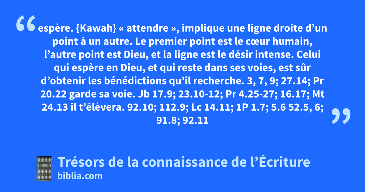 espère. {Kawah} « attendre », implique une ligne droite d’un point à un autre. Le premier point est le cœur humain, l’autre point est Dieu, et la ligne est le désir intense. Celui qui espère en Dieu, et qui reste dans ses voies, est sûr d’obtenir les bénédictions qu’il recherche. 3, 7, 9; 27.14; Pr 20.22 garde sa voie. Jb 17.9; 23.10-12; Pr 4.25-27; 16.17; Mt 24.13 il t’élèvera. 92.10; 112.9; Lc 14.11; 1P 1.7; 5.6 52.5, 6; 91.8; 92.11